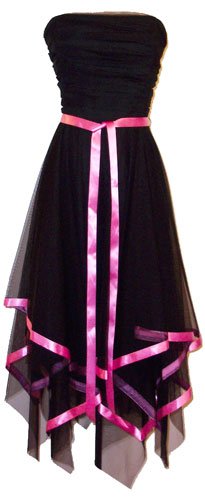 This dress is sooooooooo pretty. I bought this in pink and black and pink. The picture was impressive but having it in person made it look even better. The hem is simply gorgeous!! It goes past the knee but above the ankle for me (I'm 5'5"). I fit - just barely - in the XS because this company makes their dresses somewhat large (I'm about a 3-5 in junior sizes). I never really trusted strapless dresses much so I was very happy to have the extra straps included! The inside of the dress is very soft and the outside is mesh so it's not the softest material but it fits the style a lot better than satin would and makes it look very floaty. The semi-sheer fairy hem is so unique and so gorgeous it'll make you feel like a goddess. And the price is simply unbeatable!! This company is very reliable - they shipped it fast and arrived in VERY good condition (Macy's does a poor job with their packaging...I was very disappointed to order online from them) and they would make returns/exchanges within 30 days. I recommend both the company AND the dress!!